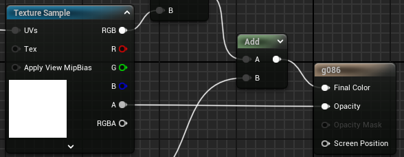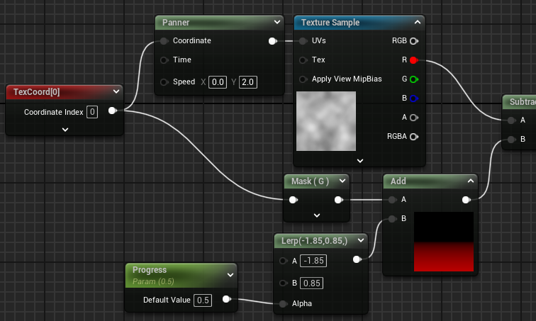 ループするのがばれるので、グレイスケールのテクスチャサンプラーを追加し、位置とスピードをずらしてブレンドするとランダム感がアップします。